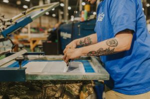 Screen printing is the process of pushing ink through a mesh stencil onto a garment, and then using heat to cure the ink to the garment. With screen printing, the ink actually sits on top of the material rather than absorbing into it. The result is a durable garment that retains its high-quality look for a very long time.